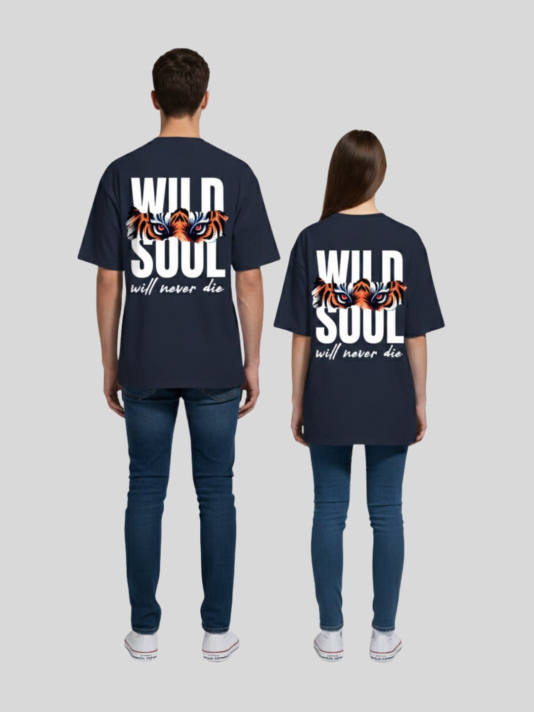 Featuring a classic round neck and half sleeves, the oversized silhouette delivers a modern, laid-back look. The front comes with a subtle typography print, while the back stands out with a high-definition “WILD SOUL Will Never Die” graphic with tiger eyes, adding a powerful and edgy appeal.
