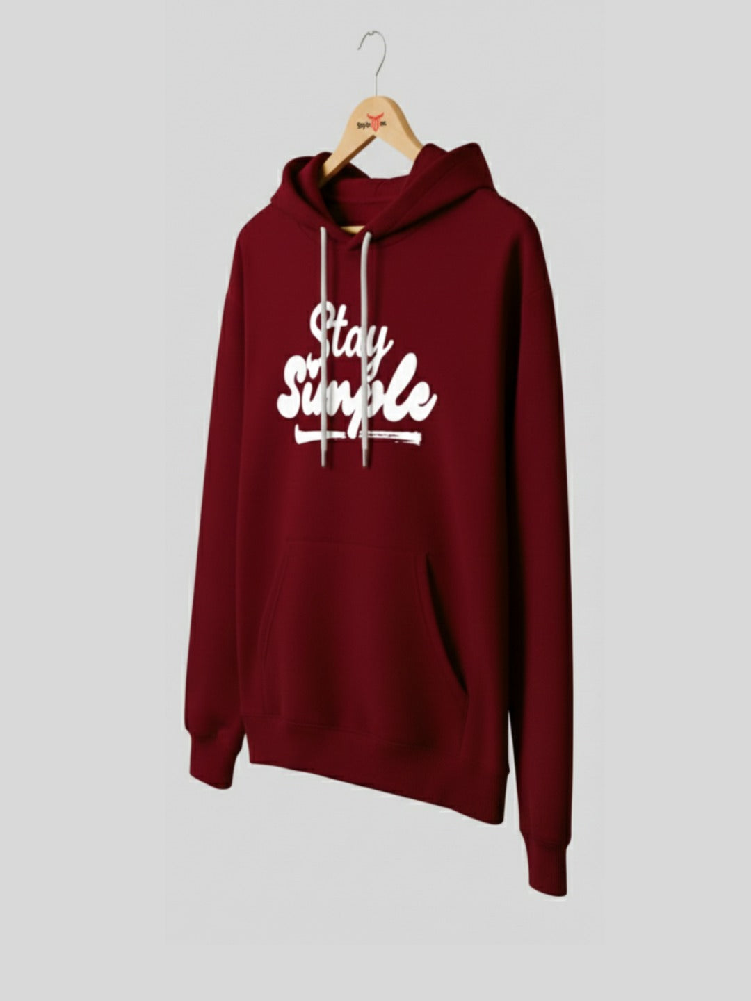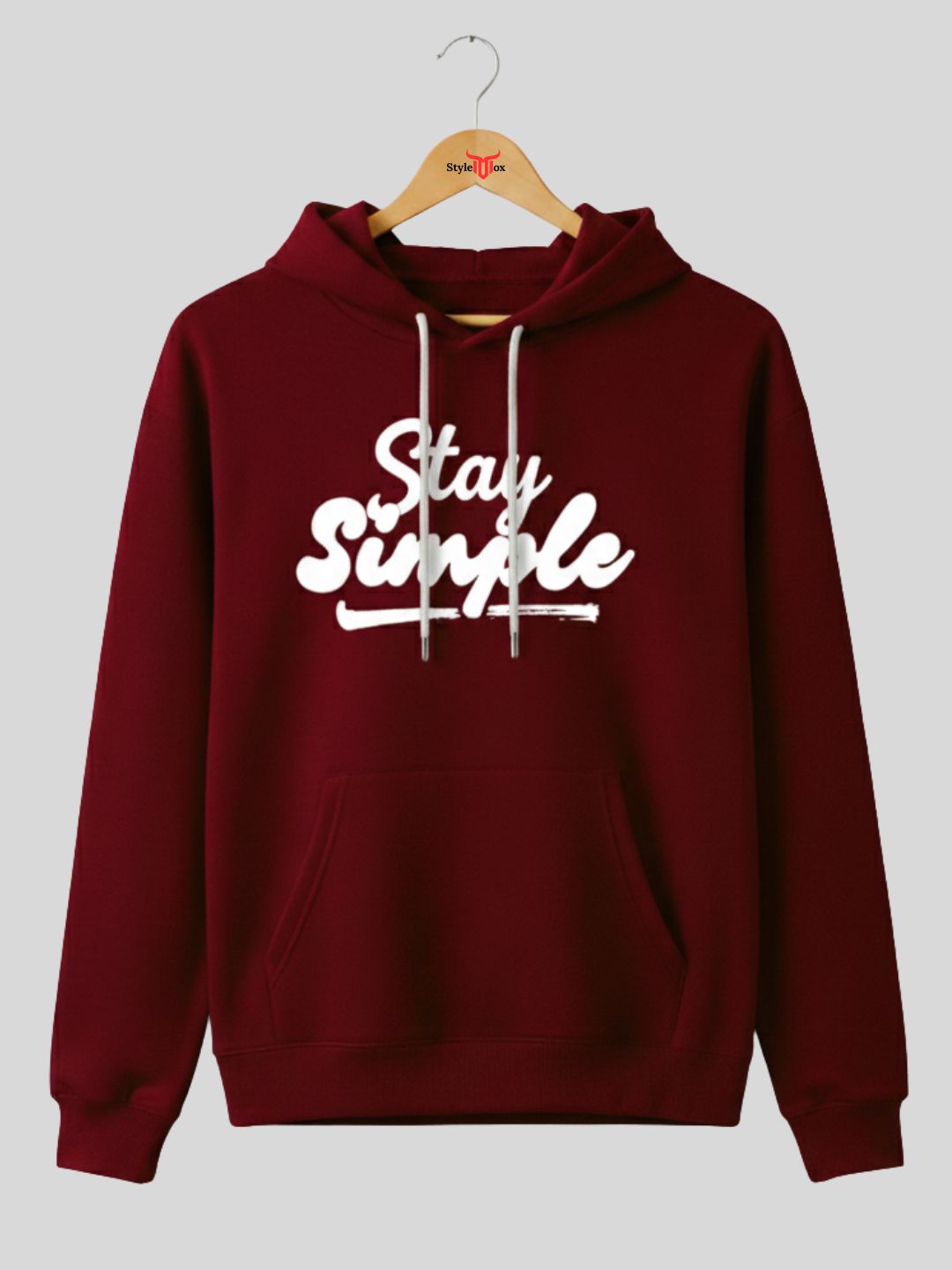 Keep your style clean, minimal, and effortlessly cool with this unisex regular-fit hoodie from Styleox. The rich maroon shade paired with a bold “Stay Simple” typography print makes it a perfect wardrobe staple for anyone who loves understated fashion with a modern feel. Crafted from a premium cotton-blend fabric, this hoodie offers softness, warmth, and all-day comfort—ideal for winter wear, casual outings, college, and street-style looks.