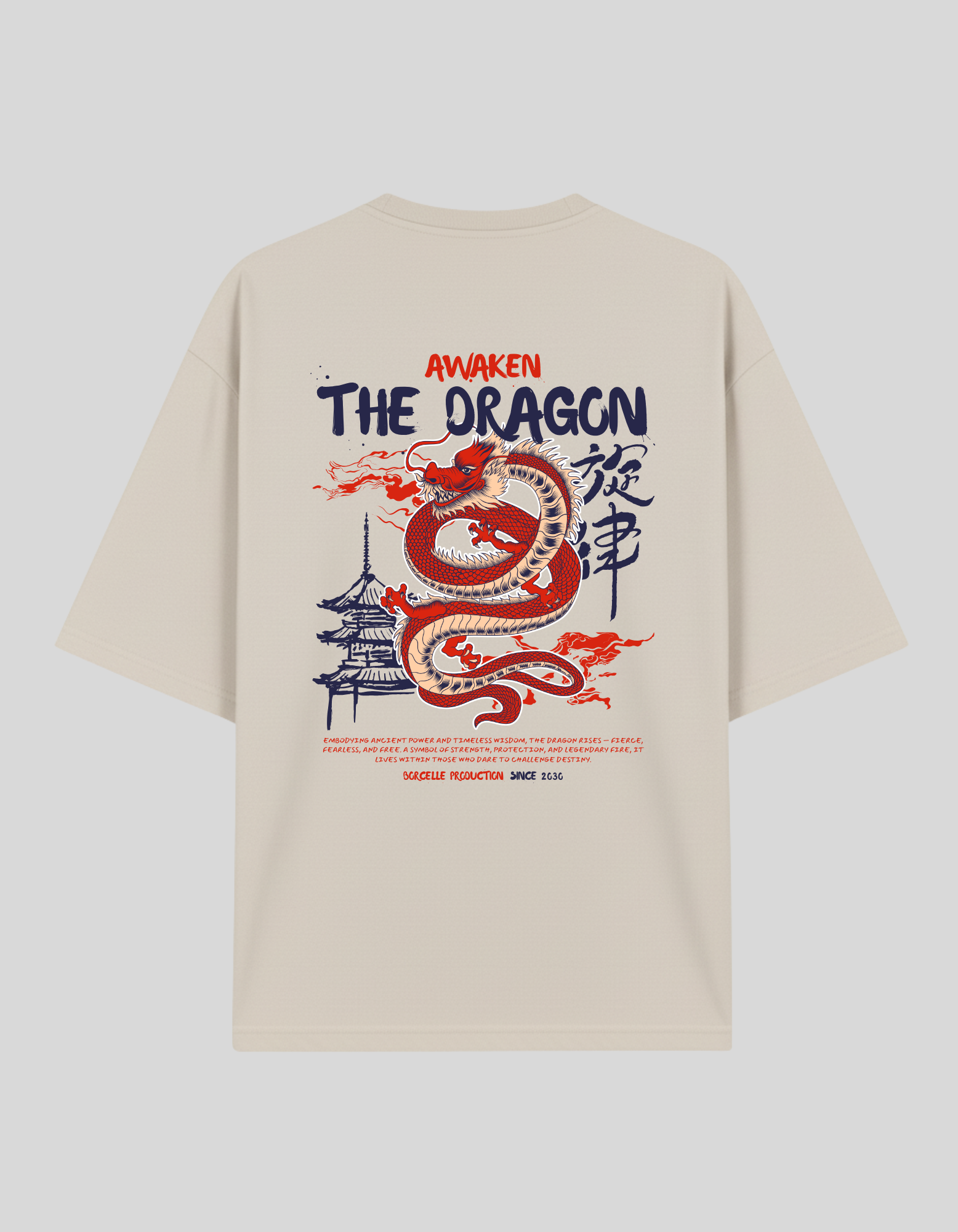 Awaken Your Inner Power. Make a subtle yet strong statement with the StyleOx Beige Oversized T-shirt. This piece features the motivational phrase "AWAKEN THE DRAGON" printed across the chest in a dynamic, slightly distressed font, using bold navy blue and subtle red accents. It's a clean, versatile design that represents strength and potential.