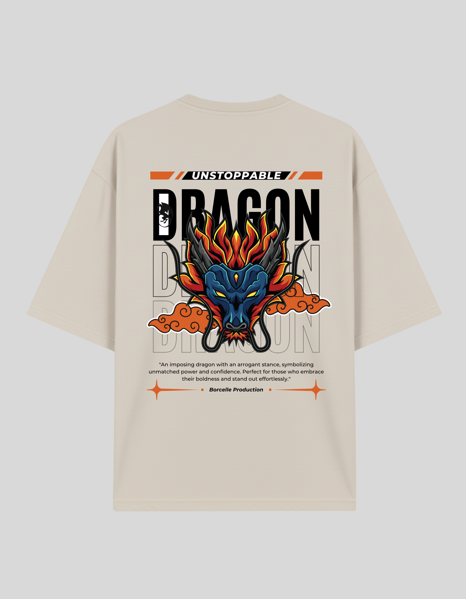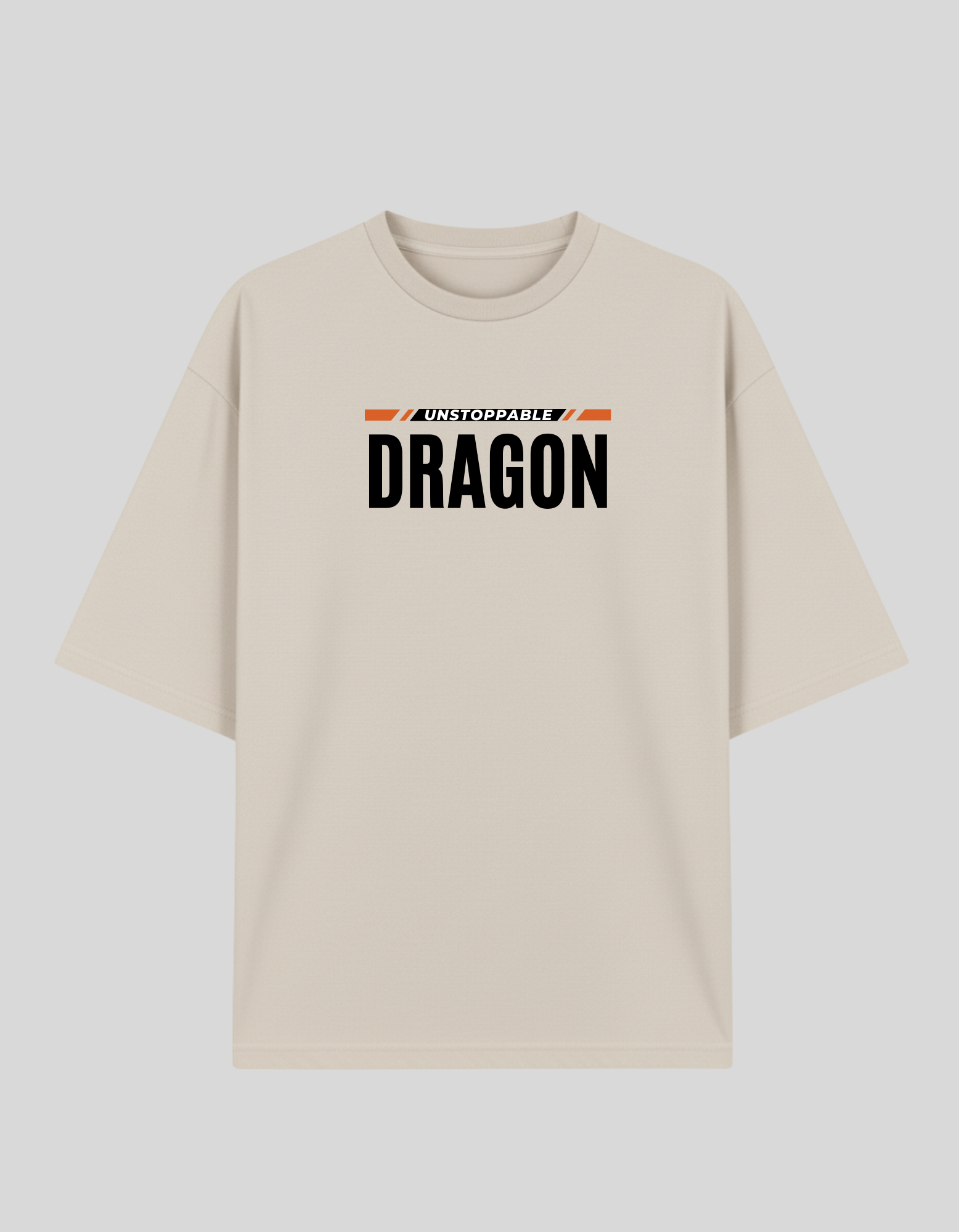 Unstoppable Power. Embrace strength and drive with the StyleOx Beige Oversized T-shirt. This bold yet minimalist tee features the powerful words "DRAGON" in black typography, underscored by the tagline "UNSTOPPABLE" in a small, striking font with orange accents. It's a clean, motivational design that pairs easily with any casual outfit.