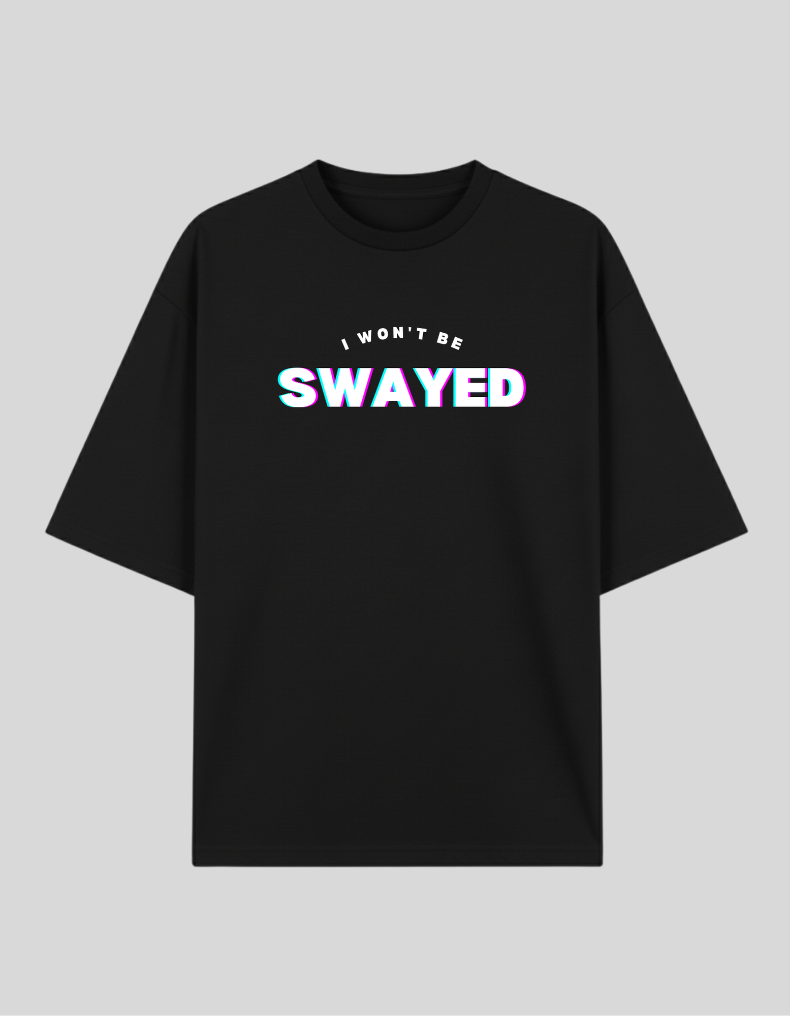 Unwavering Focus. Make a statement of confidence and determination with the StyleOx Black Oversized T-shirt. The front features the motivational phrase "I WON'T BE SWAYED" in bold, futuristic typography with a striking 3D glitch effect in cyan, magenta, and white. This clean yet powerful graphic stands out against the deep black fabric, representing firm resolve and independence.