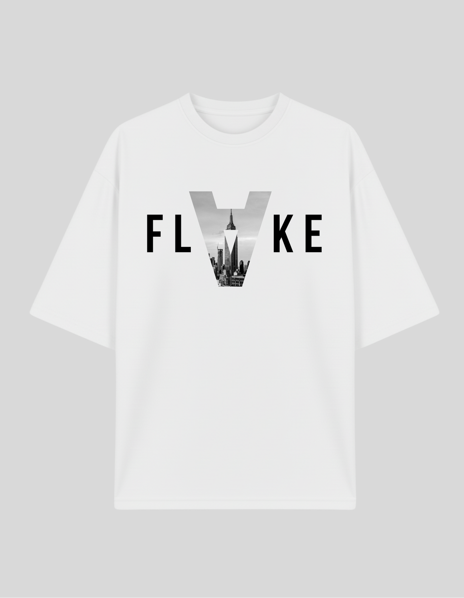 Urban Edge, Global Style. Hit the streets in the StyleOx White Oversized T-shirt, featuring a captivating, minimalist design. The front of the tee showcases the word "FLAKE" with a striking black and white New York City skyline graphic cleverly integrated into the center letter. This tee is a nod to modern street culture and global metropolitan energy.