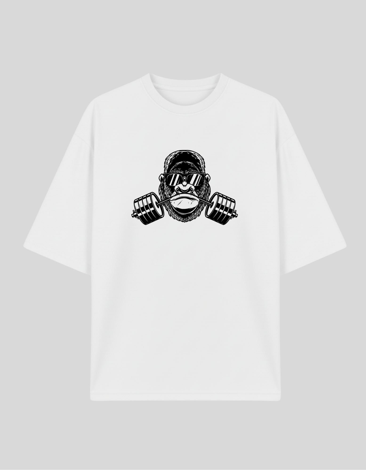UNLEASH YOUR POWER. Make a bold statement at the gym or on the street with the StyleOx White Oversized T-shirt. This tee features an aggressive, detailed gorilla graphic wearing shades and lifting a barbell, flanked by the empowering slogan, "UNLEASH YOUR POWER." It's the ultimate power flex for your wardrobe.